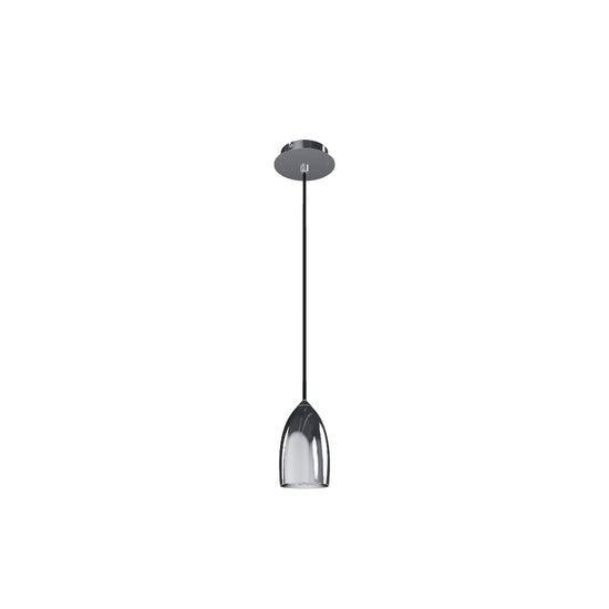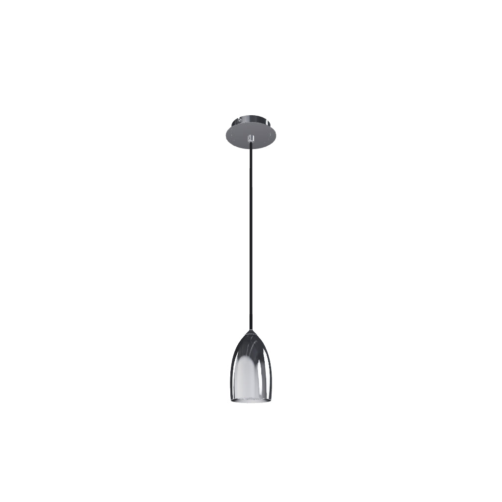 Riippuvalaisin, jossa on varjostin ja kattokanta kromia tai matta nikkeliä. Toimitetaan mustalla tekstiilikaapelilla.
