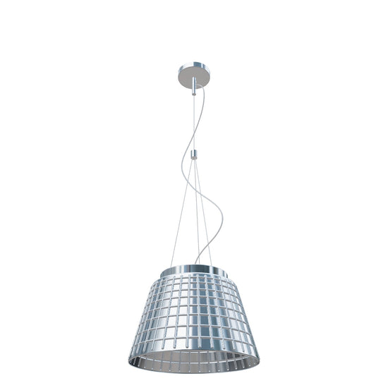 Riippuvalaisin kiinteää teksturoitua lasia, joka on kromi-päällystetty molemmilta puolilta. Valaistuna valonlähde on osittain näkyvä varjostimen läpi.