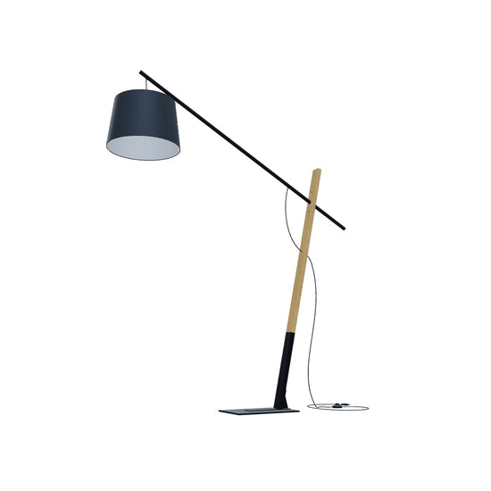 Massiivinen koristeellinen lattiavalaisin tilaviin sisätiloihin. Jalusta on yhdistelmä puuta ja metallia, kun taas varjostin on tekstiilinen.