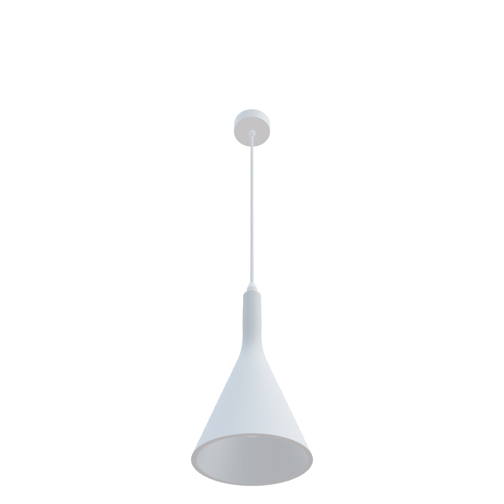Kipsiriippuvalaisin, jossa on E27-kanta ja valkoiseksi lakattu metallinen kattokorkki. Varjostimen voidaan maalata tavallisella seinämaalilla.