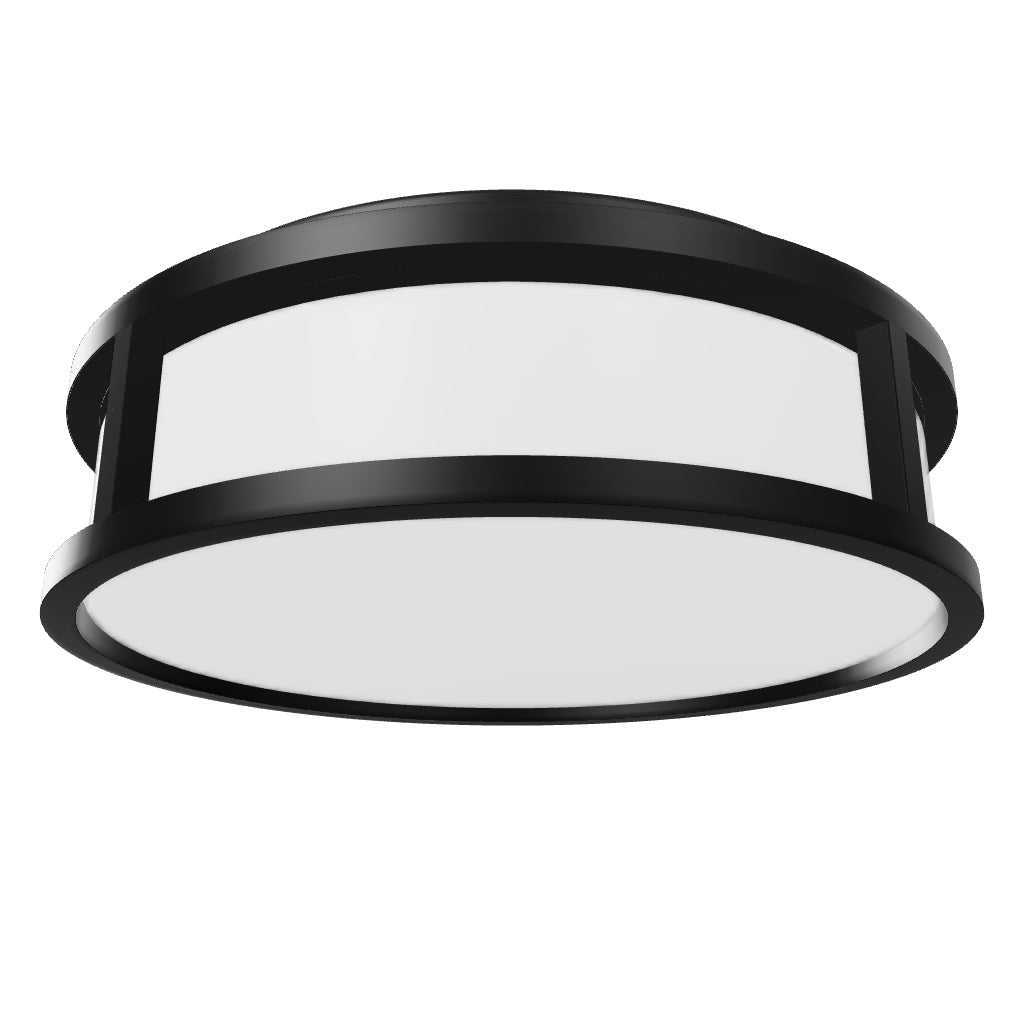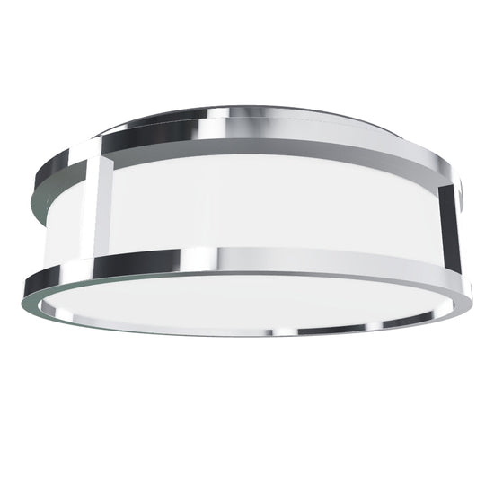 Kylpyhuoneen LED-kattovalaisin, litteällä opaalinvärisellä lasikuvulla ja metallinen kehys.