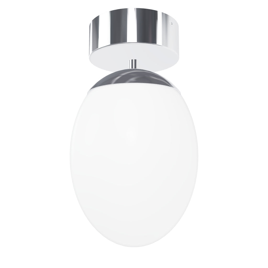 Soikea kattovalaisin lasista kromikannalla. Sopeutuu kylpyhuoneisiin.