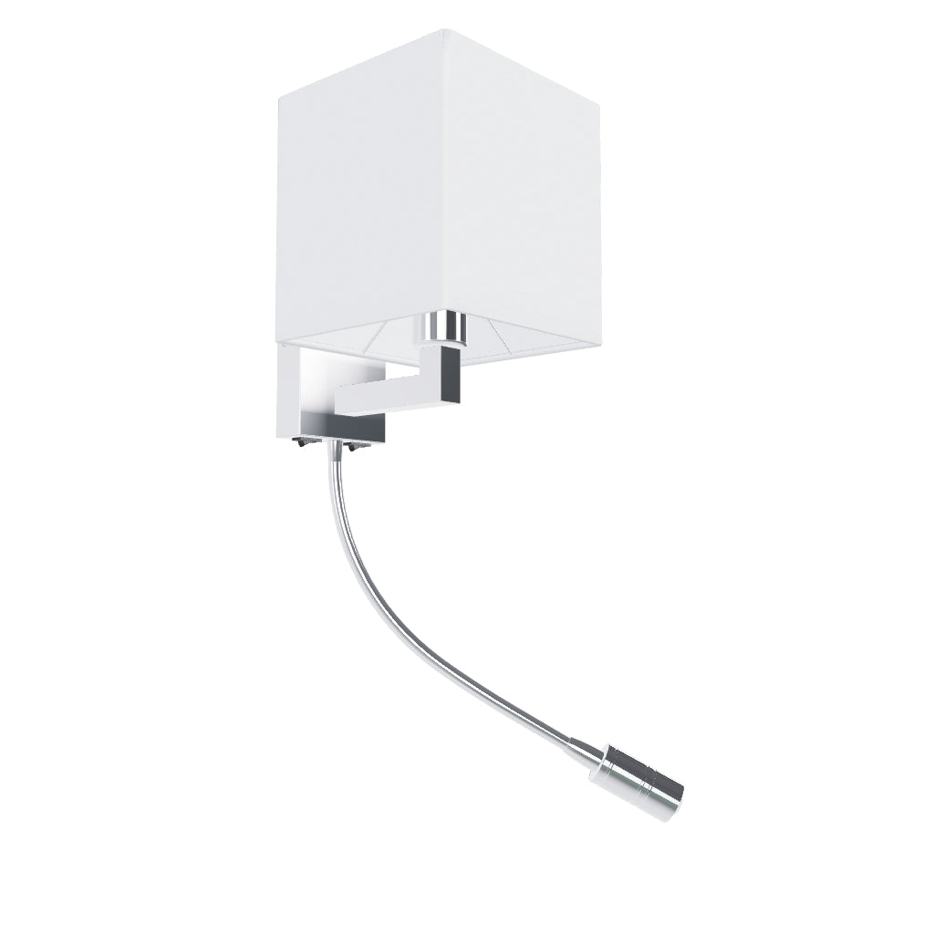 Seinävalaisin tekstiilivarjostimella ja LED-lukuvalo hanhenkaulalla. Valonlähteitä voidaan säätää erikseen, katkaisijat sijaitsee kulmikkaalla kannalla.