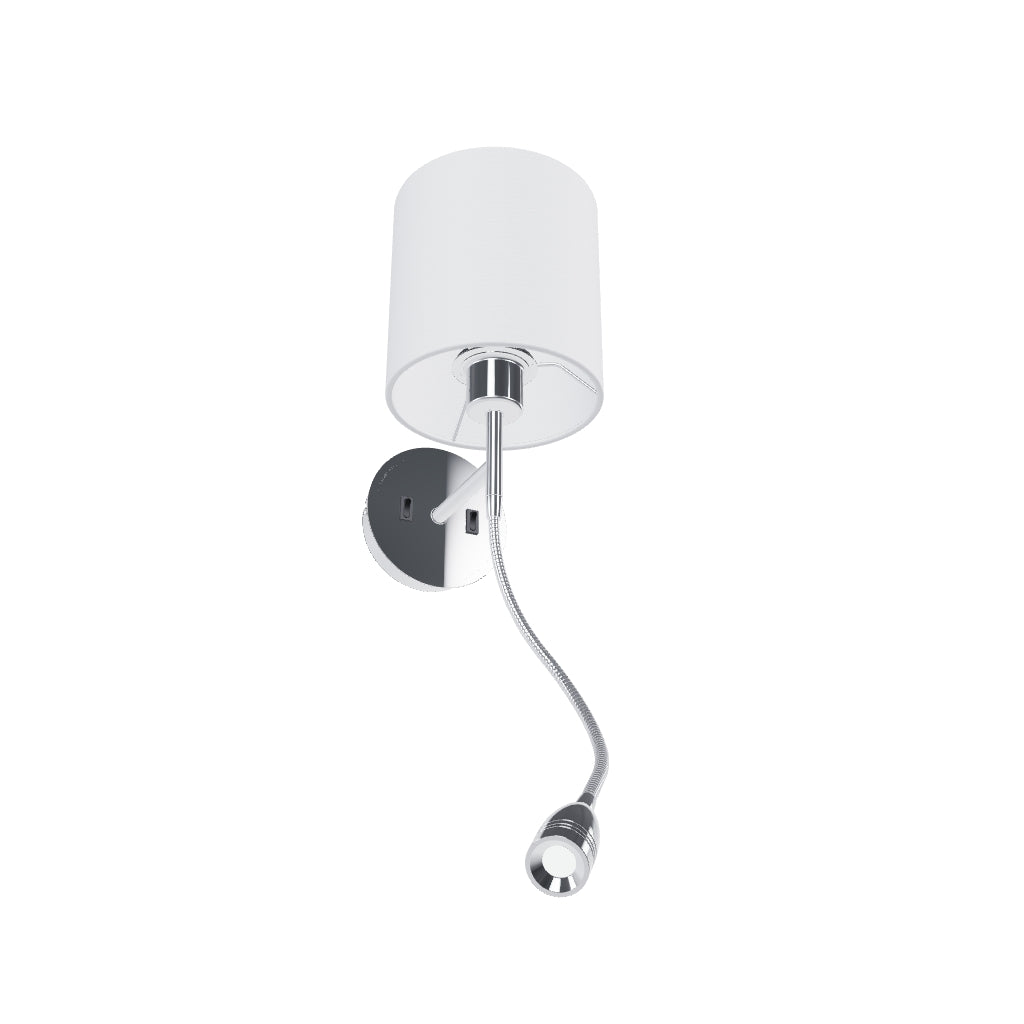Seinävalaisin tekstiilivarjostimella, ja LED-valaisin hanhenkaulalla. Valonlähteitä voidaan säätää erikseen, katkaisijat sijaitsee kannalla.